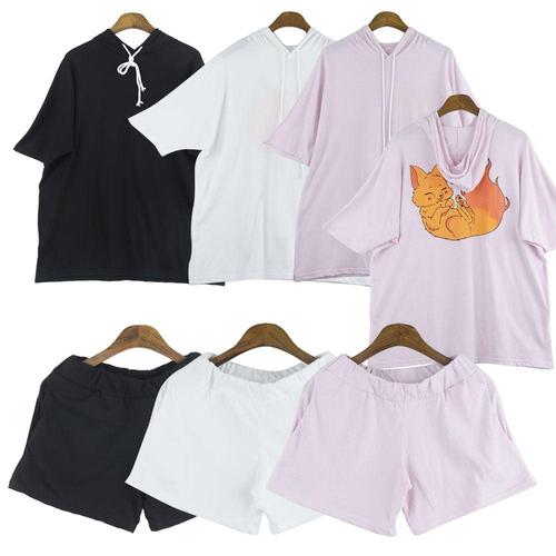 여성 봄 가을 면 후드 반팔 티셔츠 밴딩 바지 트레이닝 세트 츄리닝 셋업 PST0144S 빅사이즈 루즈핏