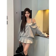 해피유통 여성용 봄가을 루즈핏 심플 슬림 후드티+나시+하이웨스트 스커트 세트 쓰리피스 LWJ