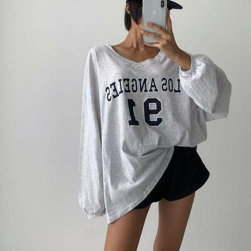 옷자락 / 여자 브이넥맨투맨 힙커버 오버핏 레터링 면 티셔츠