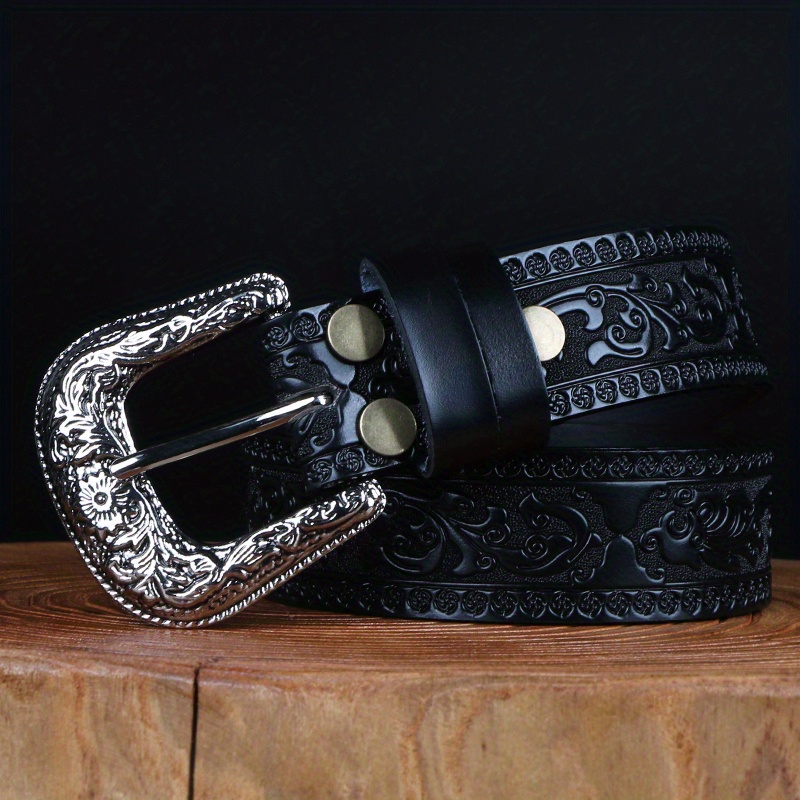 TEMU 서부 벨트 - 황소 머리 버클, 플로럴 엠보싱 디자인, 청바지 및 캐주얼 웨어용, 내구성 있는 정품 가죽 & 합금 버클, 야외 활동을 위한 스포티한 스타일