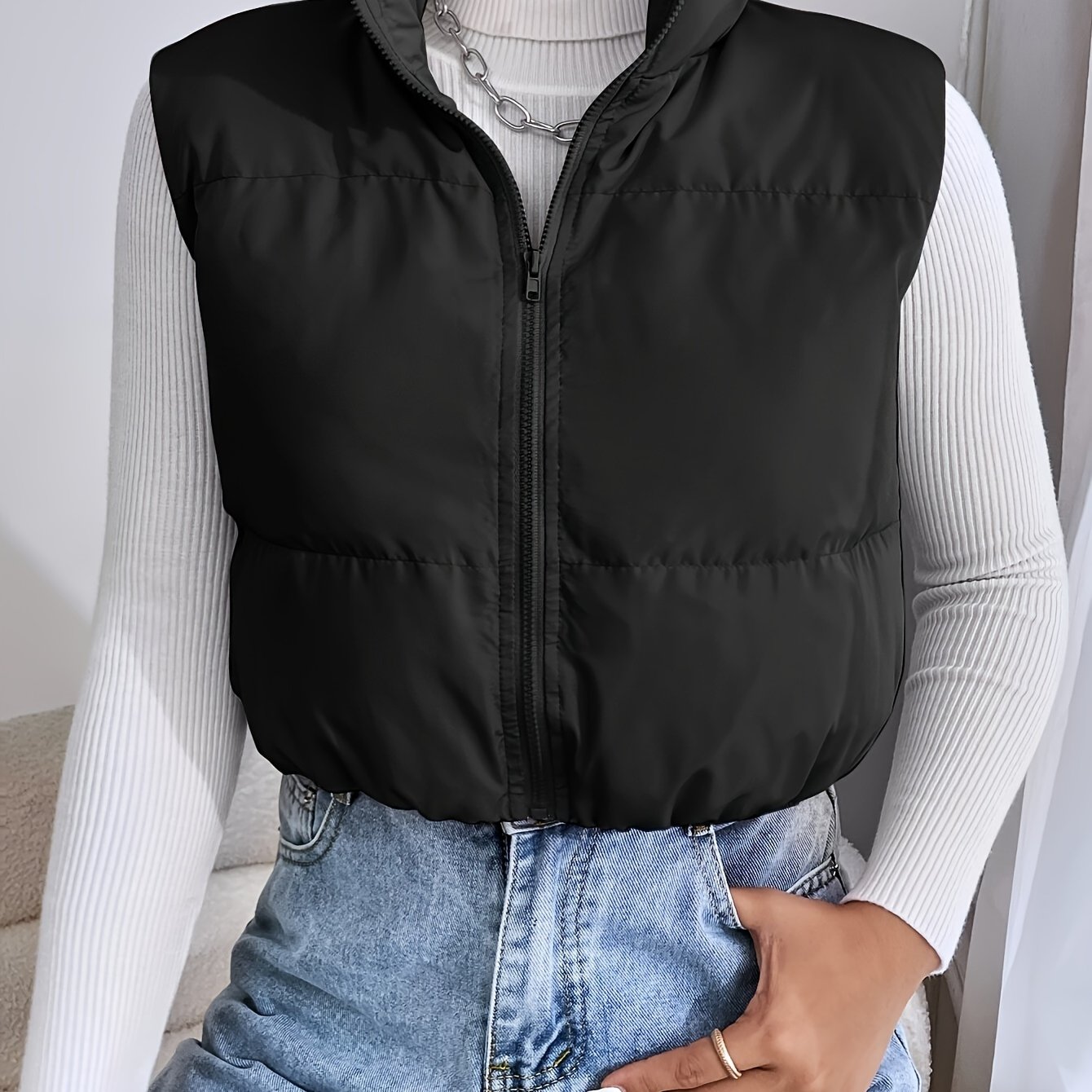 TEMU 여성용 우아한 하이넥 지퍼업 퍼버 조끼 - 단색 블랙 숏 길이 겨울 코트, 다중 포켓 및 기계 세탁 가능 레이어링 아우터웨어, 겨울 재킷