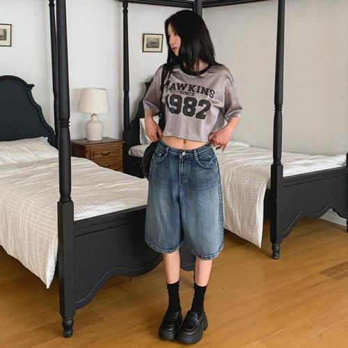 [옷자락]여성 힙무드 중청 워싱 5부 데님 반바지