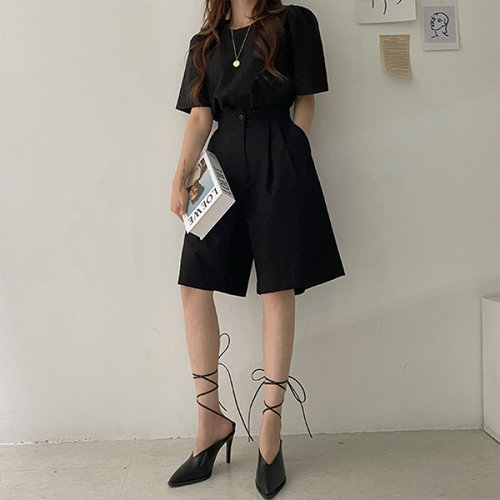 더클립 / 블러 반팔 퍼프 블라우스 5부 와이드 반바지 set