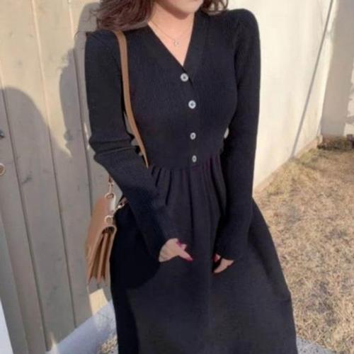 보니제이 / A라인 겨울 니트원피스 앞트임 브이넥 롱 미니버튼 슬