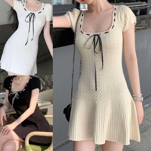 [셀러허브_여성트랜드패션]ONM A라인 니트 미니 원피스 유넥 퍼프소매 리본 끈