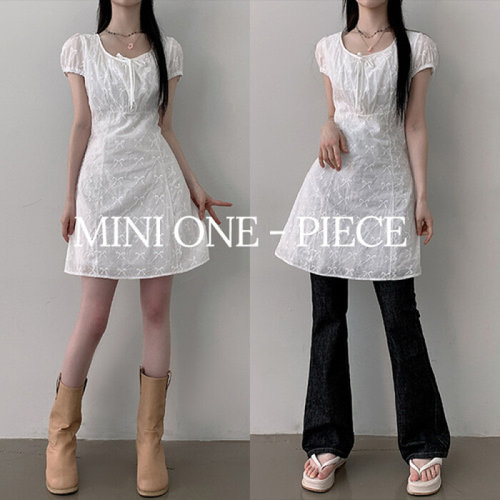 더핑크 / 컨스 A라인 리본 자수 퍼프 미니 원피스 (2color)