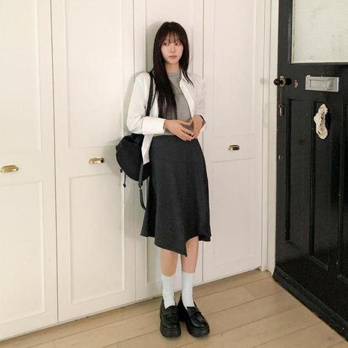 [옷자락]여자 사선 절개 트임 A라인 봄 여름 미디 스커트