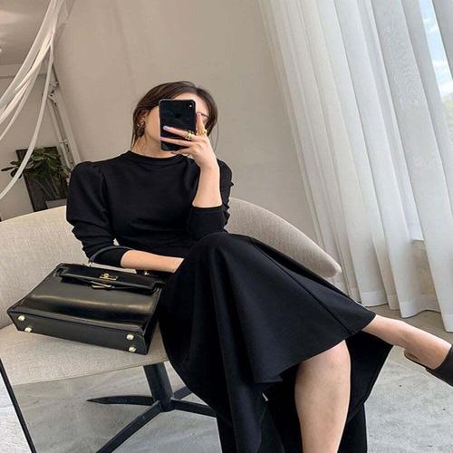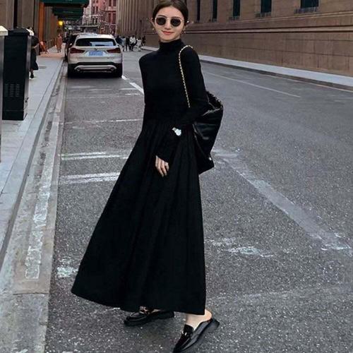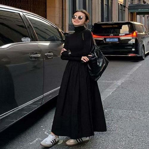 [모노무드]모노무드 여성 하이넥 하이웨스트 긴팔 롱원피스 A라인 원피스