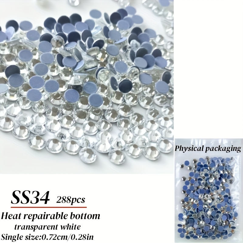 TEMU 대형 평평한 둥근 라인스톤 포장 288개, 수공예, 의류, 장식 공예용으로 사용되는 열대 라인스톤, 투명한 흰색, SS34, 7.0-7.3밀리미터.