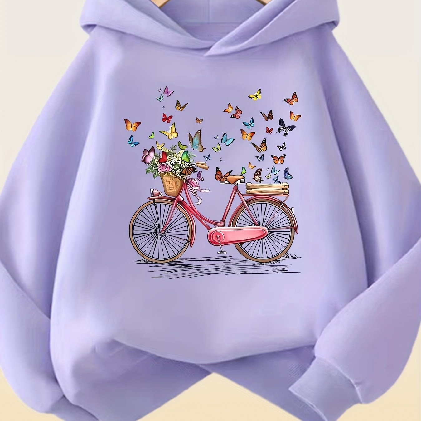 TEMU 여성용 연보라색 플리스 안감 후드티 - 기발한 나비 & 자전거 프린트, 폴리에스터 기계 세탁 가능 풀오버, 캐주얼 & 착용용, 포근한 가을 겨울 스웨트셔츠, 재미있는 디자인, 내구성 있는 원단