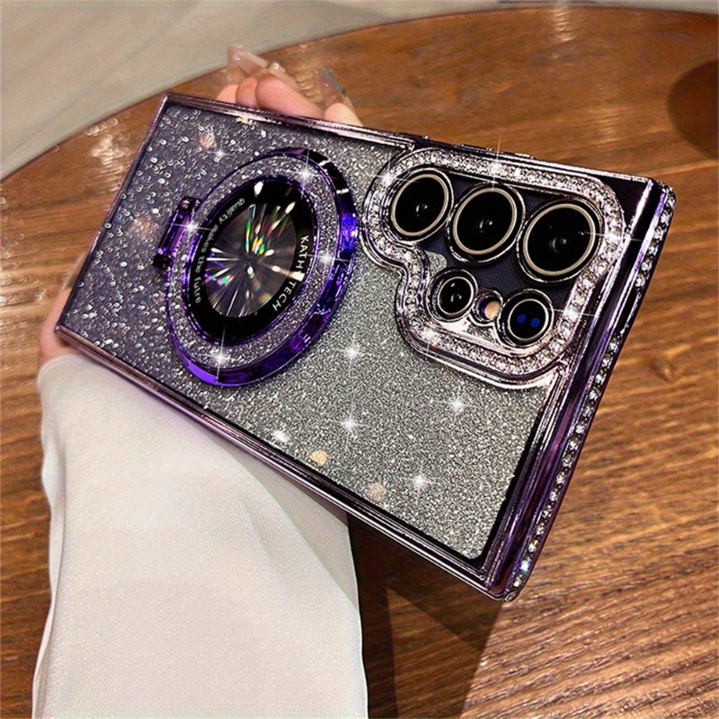 TEMU 갤럭시 S25 울트라용 우아한 케이스 디자인 - 액센트와 조절 가능한 미러 스탠드가 있는 글리터 페이드 특징, S24 울트라/S23/S22 플러스/A 시리즈용 트렌디한 충격 방지 보호를 제공하며, 여성적인 터치에 적합합니다.