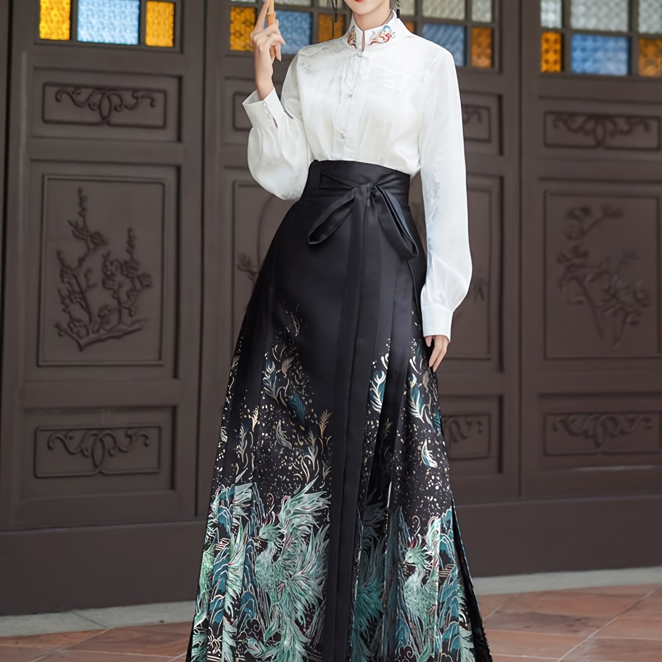TEMU 아름다운 중국 스타일 한푸 스커트 - 파란색 말 얼굴 디자인, 높은 허리, 빈티지 꽃 프린트, 플리츠 긴 스커트, 레이스업 디테일, 무대 공연 및 일상 착용용, 무대 공연 의상 | 전통 의상 | 폴리에스테르 재질