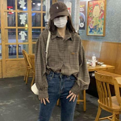 여성 체크 카라 셔츠 브라운 1P 빈티지 캐주얼 남방 WFL0OPP