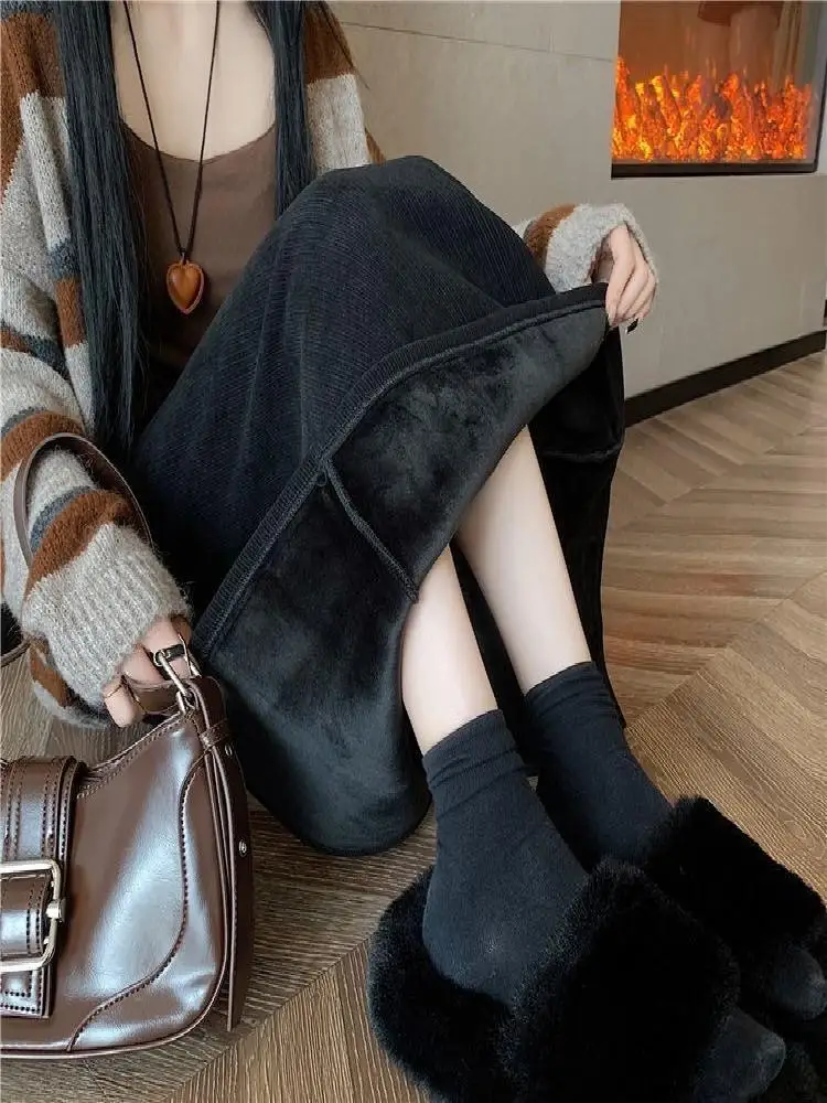 TEMU 여성용 두꺼운 따뜻한 플리스 하이 웨이트 캐주얼 롱 스커트 | 우아한 단색, 가을/겨울 시즌