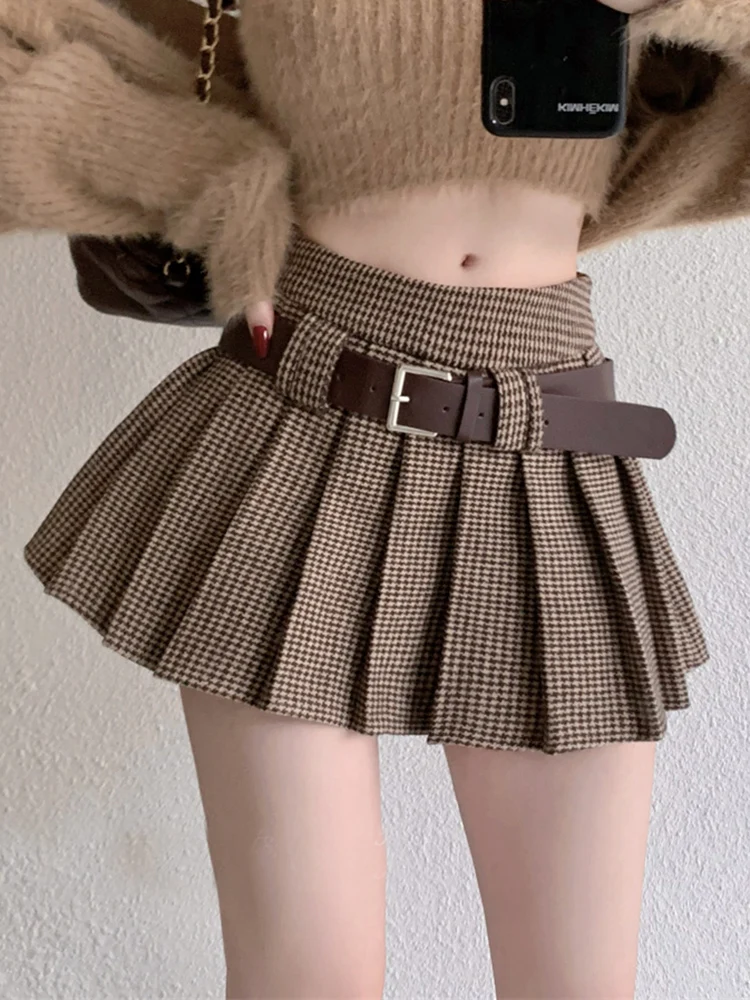 여성용 하이웨이스트 체크 미니스커트 브라운 깅엄 A라인 스커트 빈티지 스타일 플리츠 하프 바디콘 스커트 도시 출퇴근 캐주얼