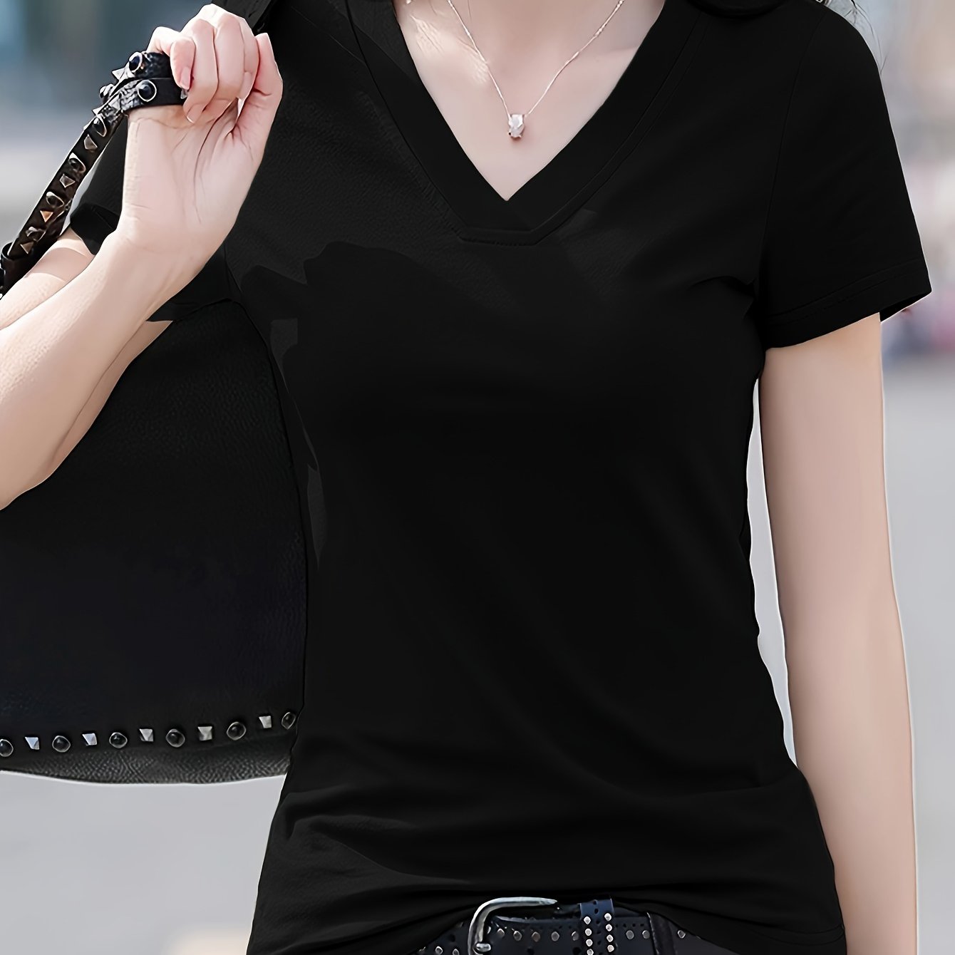 TEMU 여성 패션 V넥 티셔츠, 단색, 폴리에스터 95% 스판덱스 5%, 정상 길이, 봄/여름 니트 소재 상의, 180g/m²