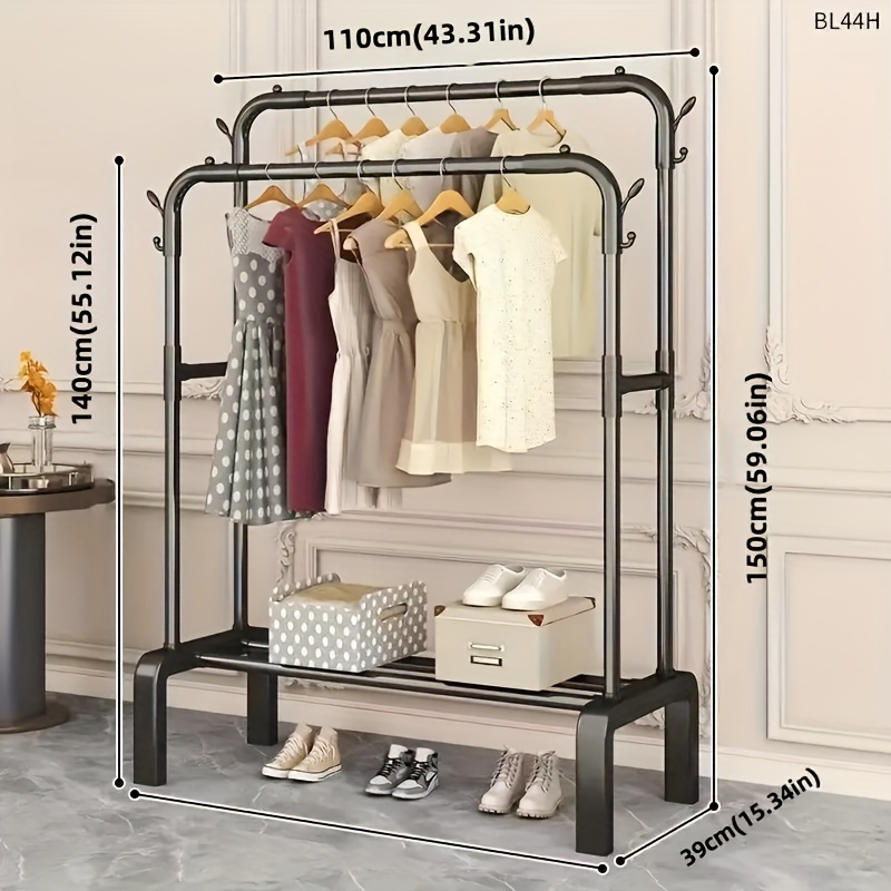 TEMU 1개 더블 로드 스탠딩 옷걸이, 다용도 의류 랙 & 모자 걸이 - 플라스틱 바닥 설치형 철제 스탠드, 침실·발코니·욕실용 내구성 강한 블랙 색상 (간편 조립)|스탠드옷걸이