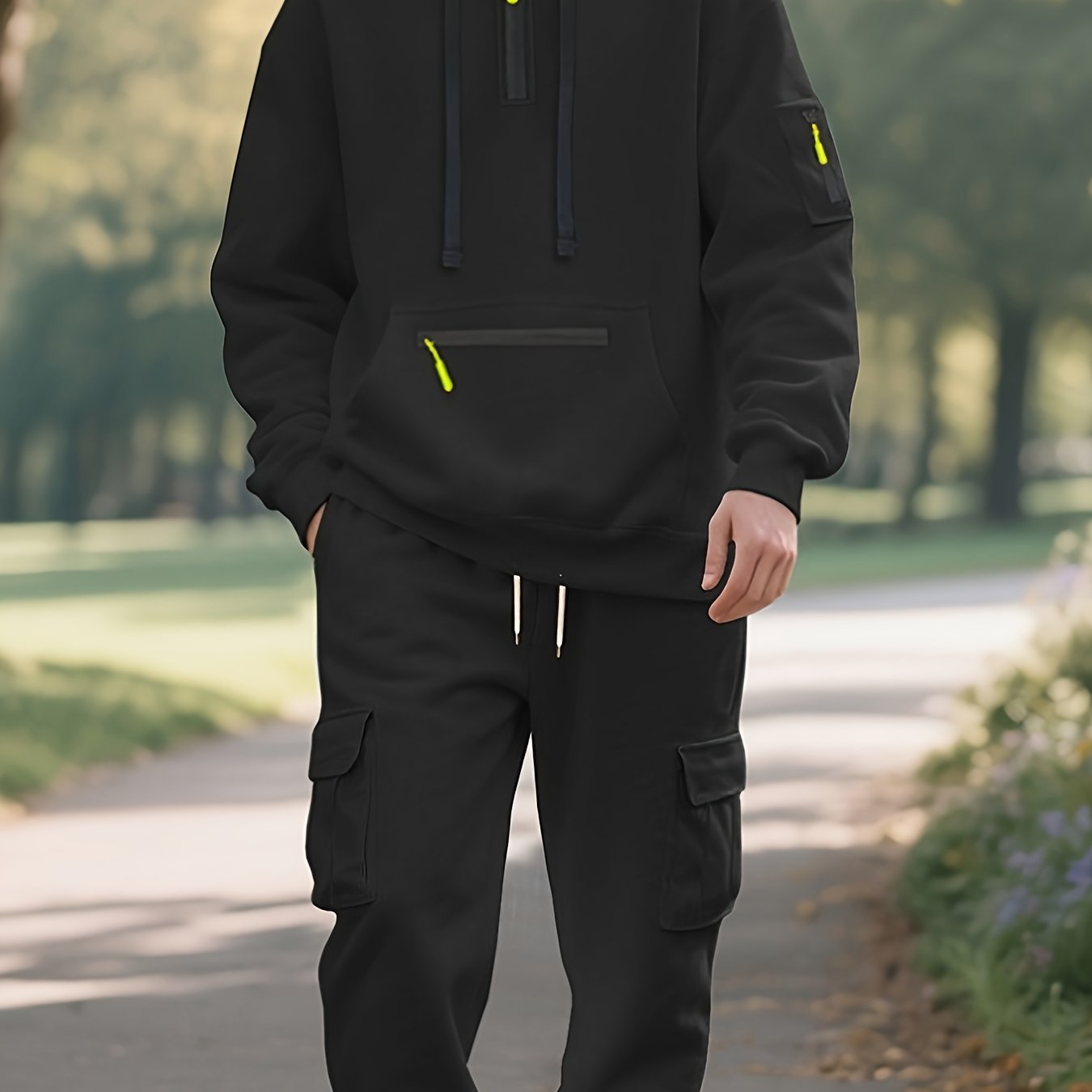 TEMU 남성용 스타일리시 블랙 후드 지퍼업 스웨트셔츠 & 조거 세트 - 캐주얼 스포츠웨어, 포켓, 루즈핏, 긴팔, 신축성 없는 원단, 가을/겨울에 완벽, 캐주얼 스포츠웨어|후드 스웨트셔츠|지퍼업 후디