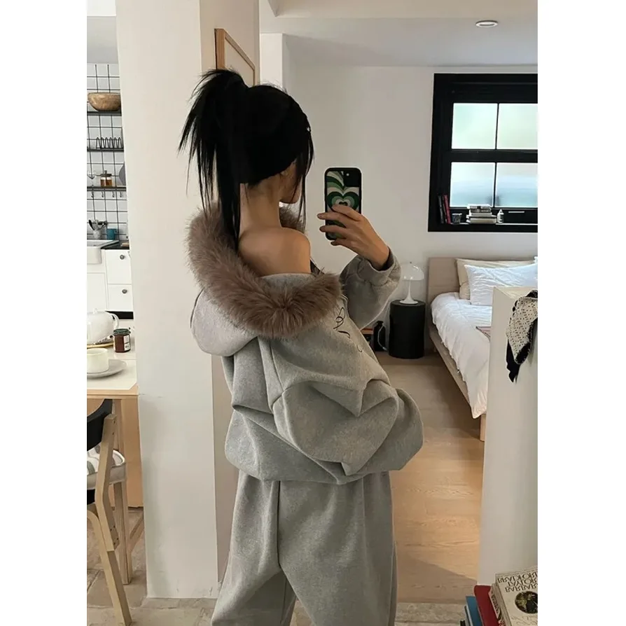 따뜻한 플리스 후드 재킷, 큰 퍼 칼라와 영어 문자 지퍼, 캐주얼 루즈핏 트렌디 스웨트셔츠 아우터웨어