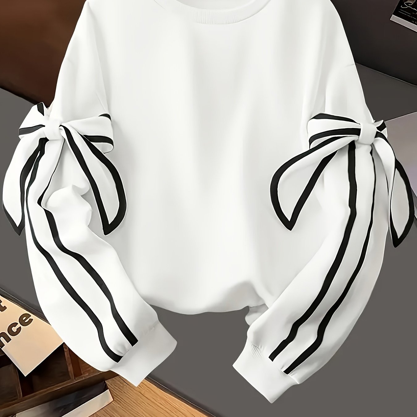 TEMU 여성용 화이트 스웨트셔츠 - 긴 소매 루즈핏 풀오버, 우아한 리본 디테일, 부드러운 데일리 캐주얼 스웨터, 세탁기 사용 가능 사계절 상의, 다재다능한 디자인, 내구성 있는 소재, 성인용