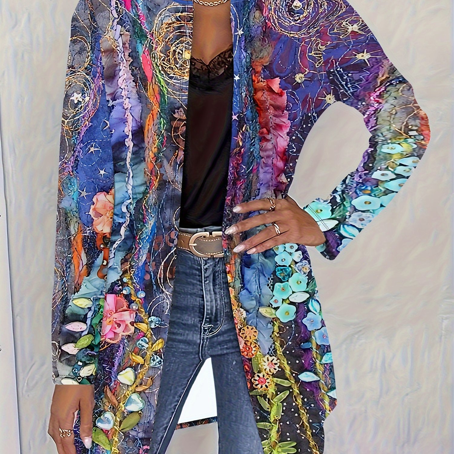 TEMU 여성용 롱 플로럴 프린트 가디건 - 멀티컬러 디자인, 기계 세탁 가능, 라이트웨이트 긴소매 커버업, 사계절 캐주얼 & 포멀 웨어 레이어링 피스, 아티스틱한 디테일 패턴