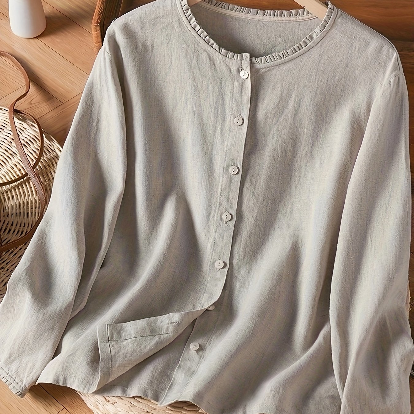 TEMU 여성용 우아한 캐주얼 롱 슬리브 블라우스 - 소프트 라운드넥 버튼업 셔츠, 솔리드 컬러 올시즌 탑, 세탁기 사용 가능 레귤러 핏, 편안한 원단, 캐주얼 웨어, 비투명 소재