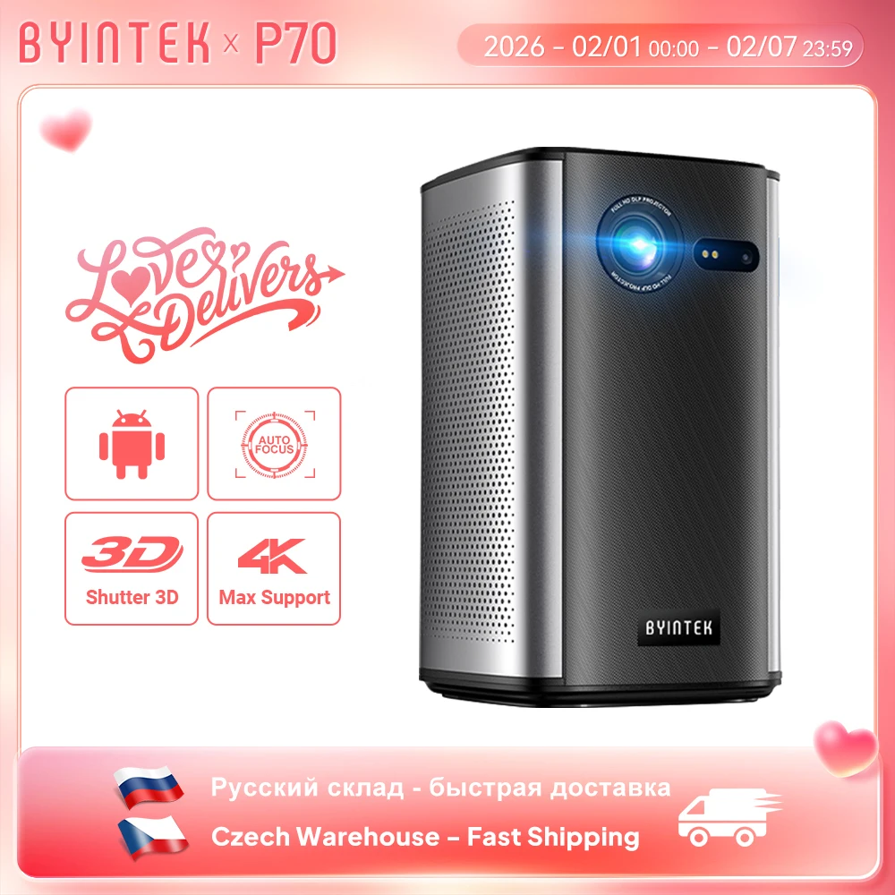 BYINTEK 미니 휴대용 프로젝터 DLP 자동 초점 스마트 안드로이드 와이파이 LED 1080P 홈 시어터 비디오 프로젝터, 배터 포함, P70 3D 4K