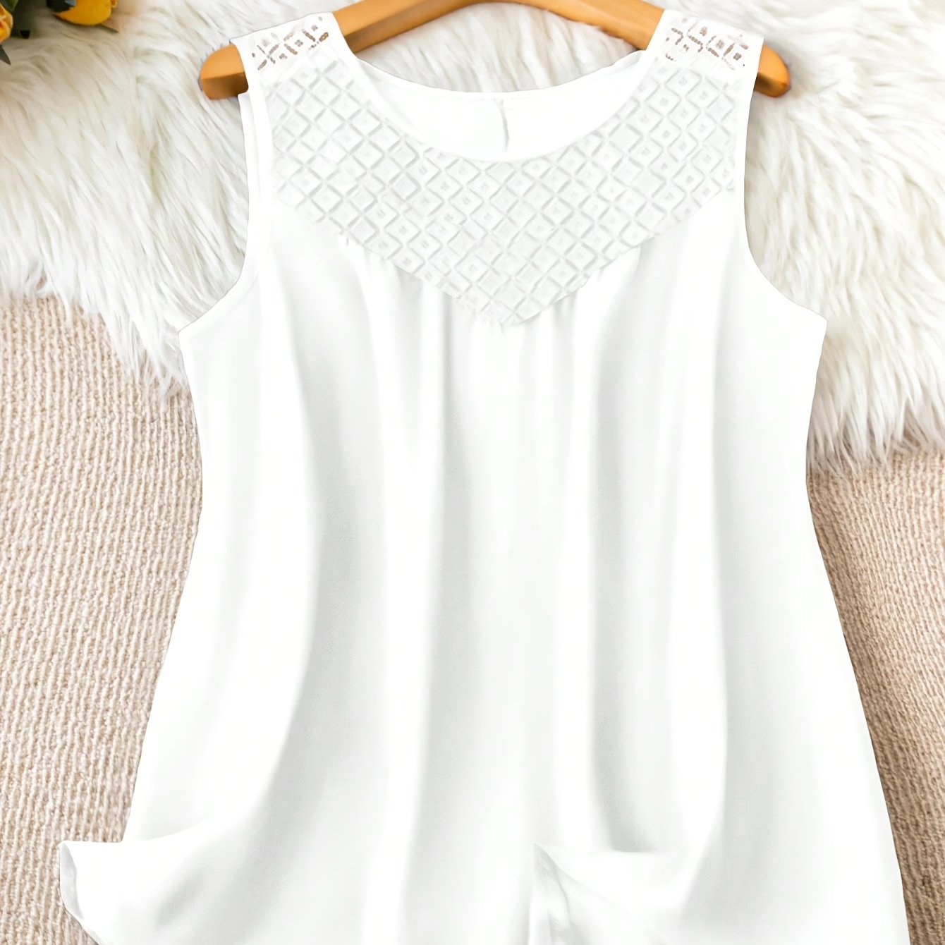 TEMU 플러스 사이즈 - 우아한 민소매 레이스 패치워크 탱크 탑 | 루즈핏, 크루넥, 약간의 스트레치 원단, 봄/여름/가을용 단색