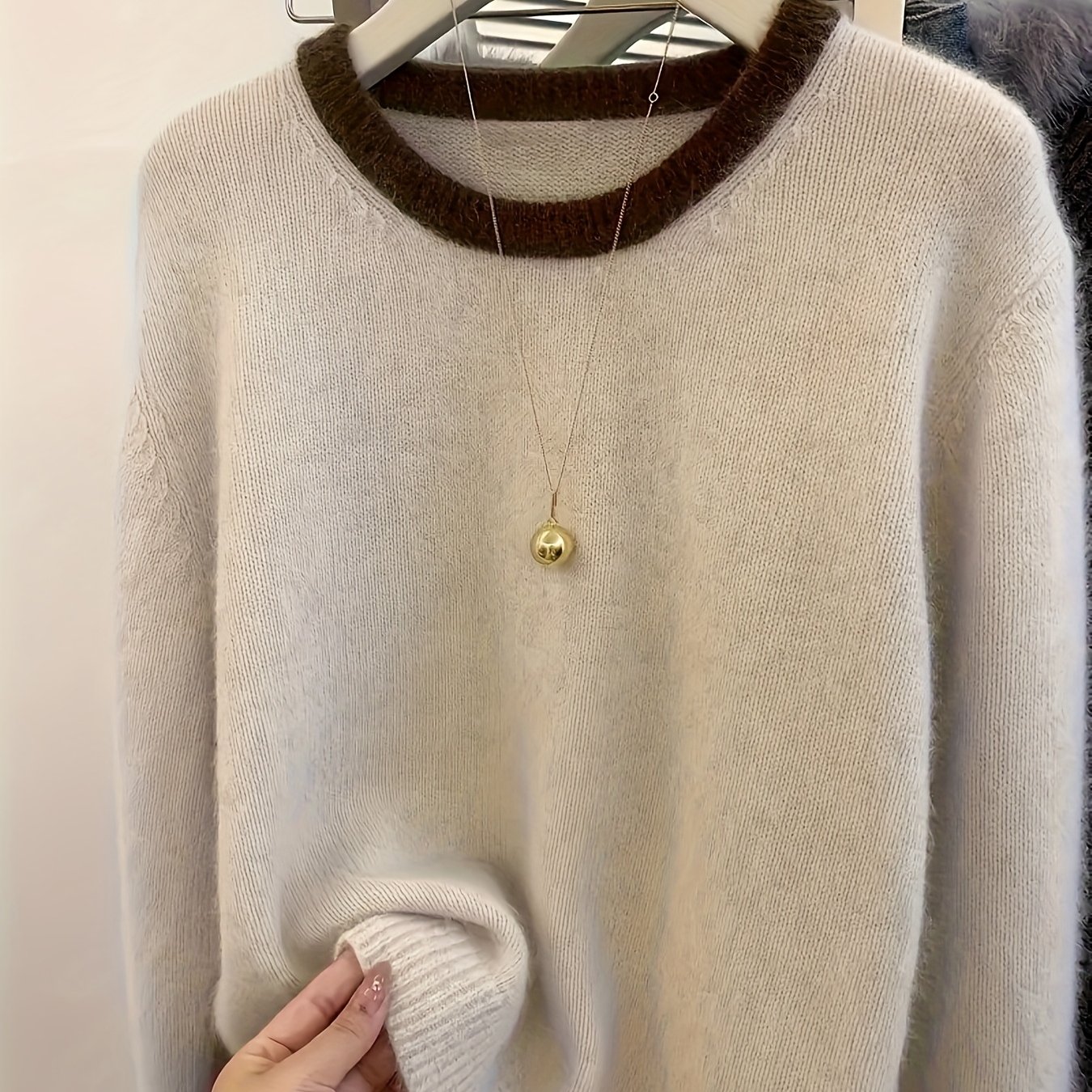 TEMU 여성용 포근한 스웨터 - 소프트 풀오버 스웨터, 브라운 트림, 긴소매 라운드넥 스웨터 (가을/겨울), 데일리 & 포멀룩 - 여성용 간편 관리 스웨터, 스웨터, 겨울 의류, 중간 탄성 원단, 가을 패션, 클래식 디자인