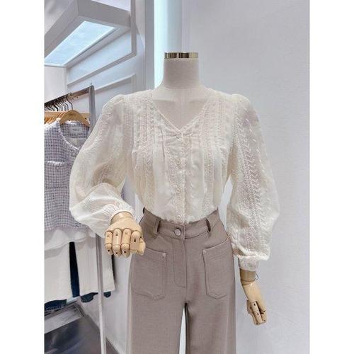 [하프클럽/]페미닌무드 꾸안꾸 펀칭 레이스 브이넥 긴팔 블라우스