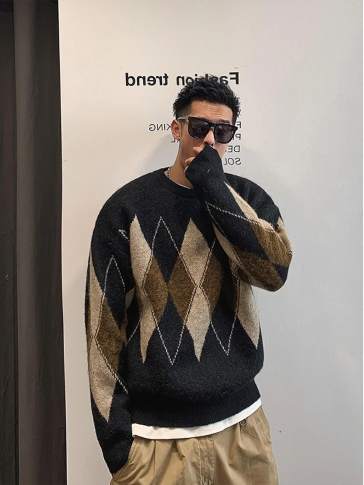 미국 캐주얼 남성 니트 스웨터 루즈 라운드 넥 니트웨어 빈티지 다이아몬드 패턴 젊고 트렌디한 봄 가을 착용