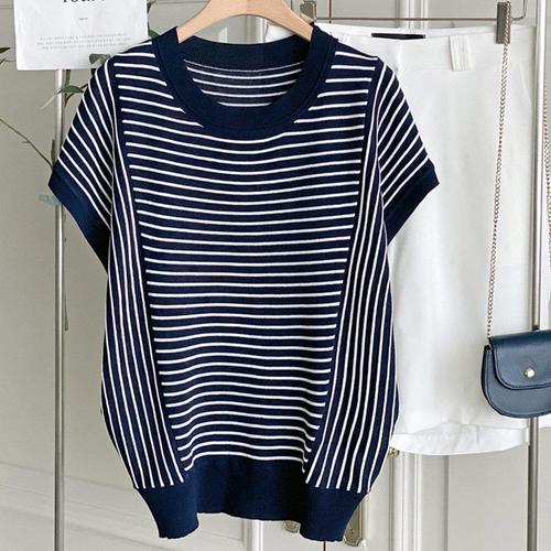 [샵앤][샵앤] 여성 라운드넥 단가라 가오리핏 니트 티셔츠 DGB-WKN-4555-네이비