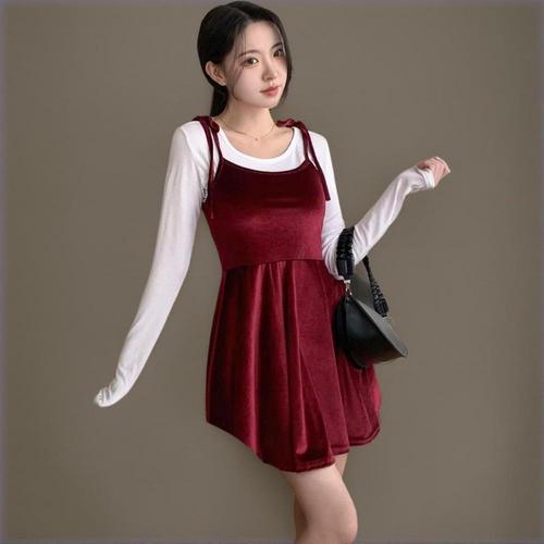 [옷자락] 여자 가을 겨울 연말 파티 벨벳 셔링 끈나시 미니원피스
