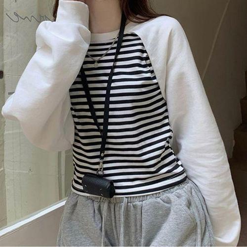[에이치플러스몰]티셔츠 배색포인트 가을 봄 라운드넥 크롭 니트티