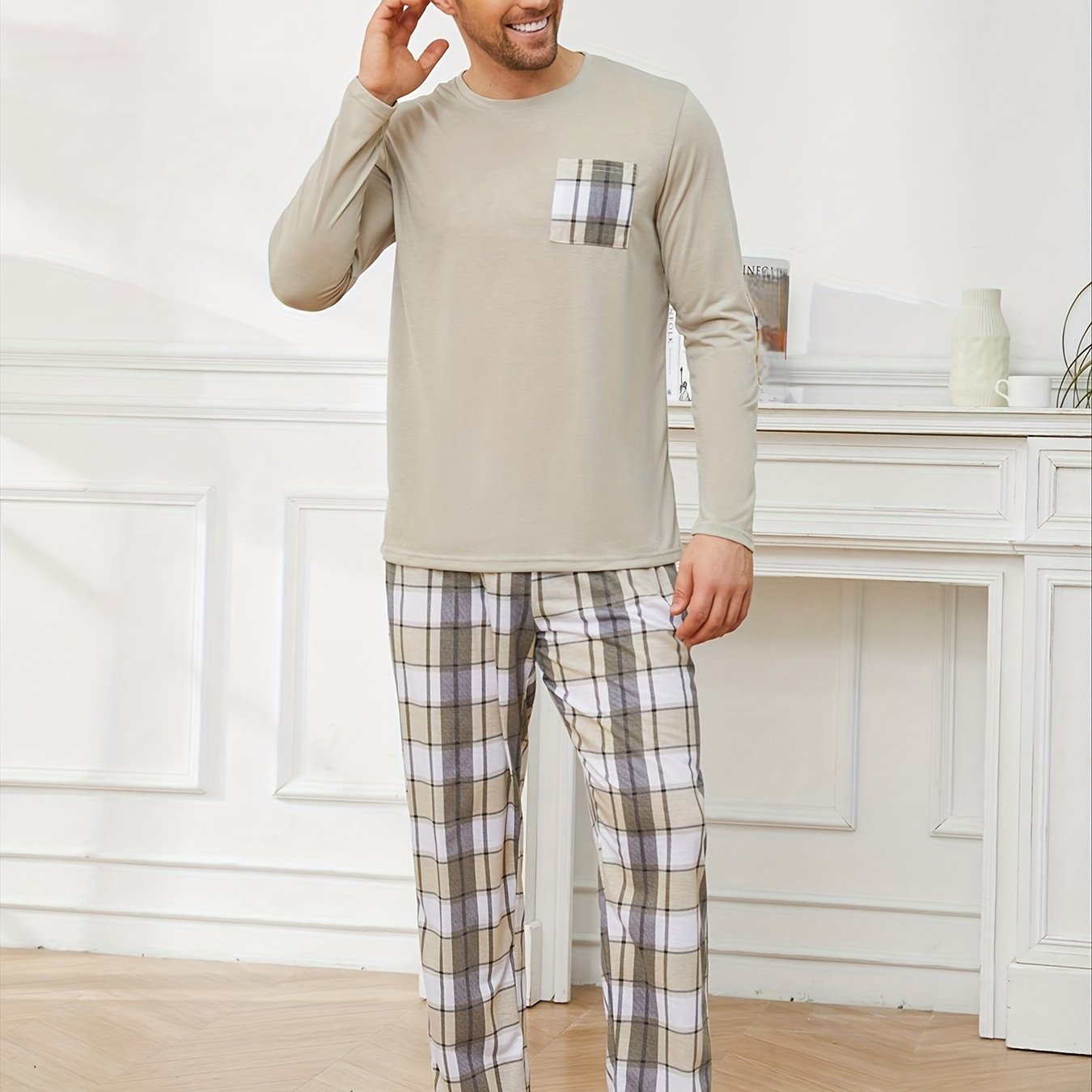 TEMU 남성 & 청소년용 체크무늬 파자마 잠옷 2세트 - 긴팔 V넥 셔츠 & 매칭 팬츠, 루즈핏 파자마 세트, 봄/가을 나이트웨어 (세탁기 사용 가능, 캐주얼 의류) - 2세트 번들
