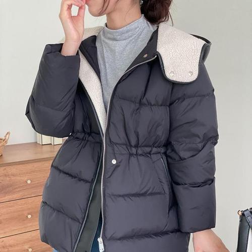 [다잇템]여자 오리털 패딩 레더후드 드로우코드 점퍼 (18994462A)