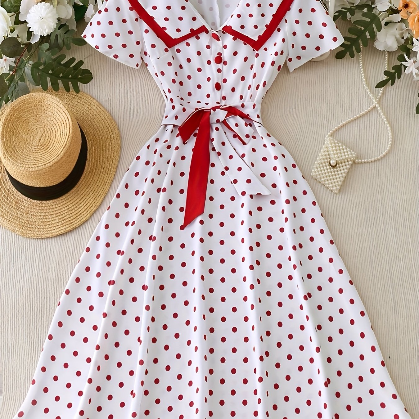 TEMU 여성용 1950년대 빈티지 폴카 도트 A라인 드레스 - 벨트 허리 & 리본 디테일, 플레어드 반소매, 버튼 프론트, 세탁기 사용 가능 - 우아한 파티 & 캐주얼 봄/여름 레트로 원피스