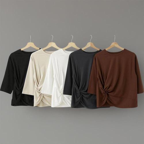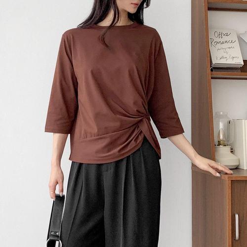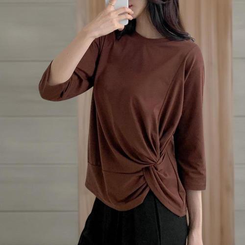 |KST96AE|여성 스판 갈색 라운드넥 칠부 티셔츠 꼬임 디자인