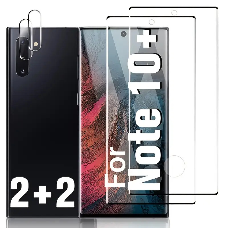 TEMU 2개 세트 강화유리 스크린 보호필름 + 2개 세트 카메라 렌즈 필름, 풀커버 3D 고보호 투명 HD 초박형 지문방지 기포없음 9H 경도, 삼성 갤럭시 노트10+/노트10용