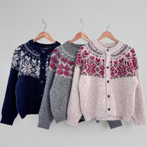[미라클세븐]여성용 가을 겨울 하트 눈꽃 패턴 노르딕 라운드 니트 가디건