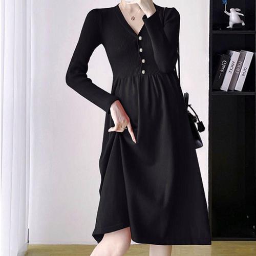[엄지척]단추 니트 블랙 니트원피스 원피스 A라인 골지 겨울원_19958762_667501