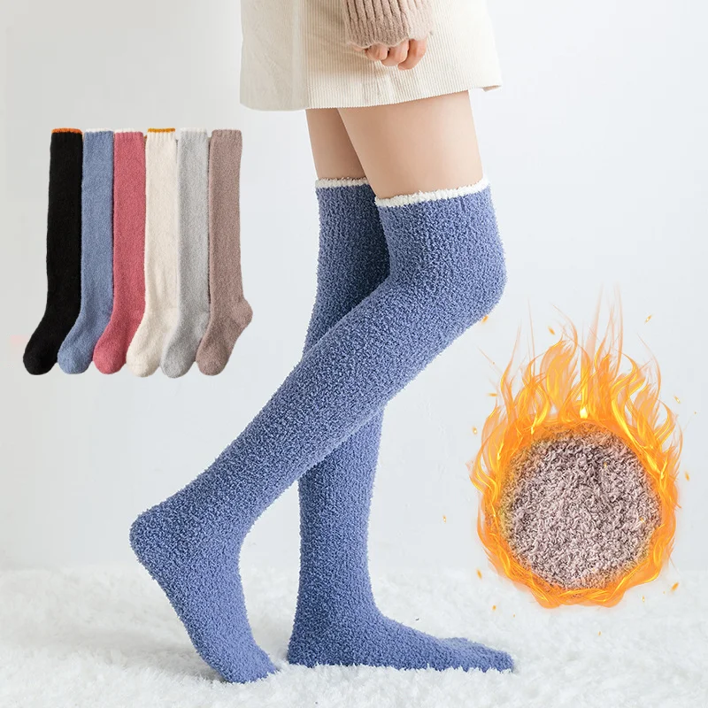 여성용 따뜻한 플러시 허벅지까지 오는 양말 겨울용 코랄 플리스 무릎 위 긴 양말 홈 슬립용 EU 35-40 단색