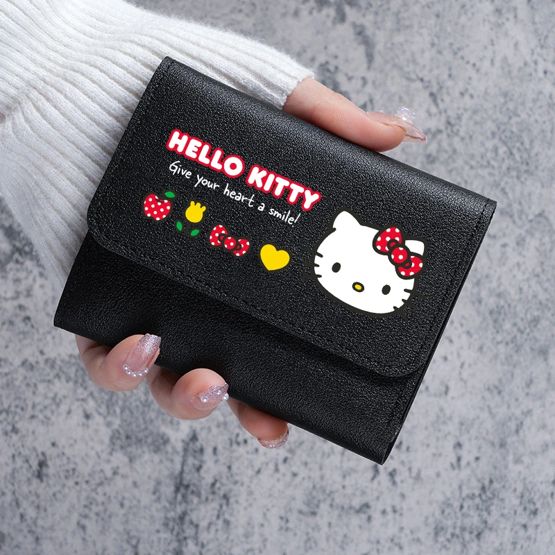 헬로 키티 이중 접이식 짧은 지갑, 여행, 학교, 일상용으로 다중 수납 공간 디자인을 갖춘 슬림하고 가벼운 PU 가죽 카드 홀더