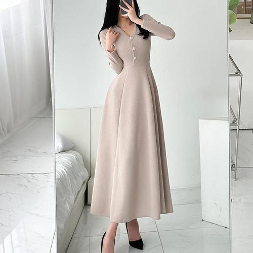 [옷자락] 여성용 신축성 브이넥 슬림 골지 롱 원피스