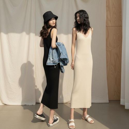 2컬러 골지 니트 롱원피스 나시 슬림스커트 블랙 코디 민소매 봄치마 스프링 데일리