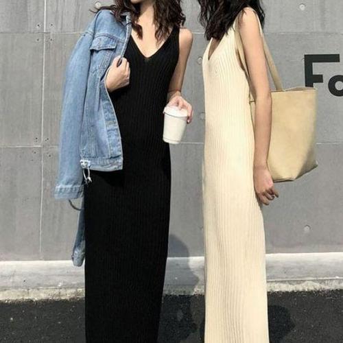 여성 골지니트 민소매 롱원피스 이너 슬림핏 원피스 3색 WFKXMEC