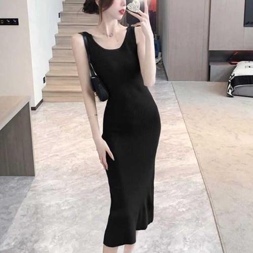[미라클세븐]여성 독특한 뒷트임 골지 민소매 니트 롱 드레스