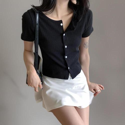[다잇템]여성 골지 반소매 탱크 세로 단추 U넥 가디건