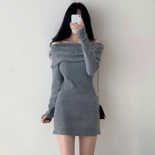 [라일리여성의류] Rly 여성 여리핏 오프숄더 골지니트 긴팔 미니원피스