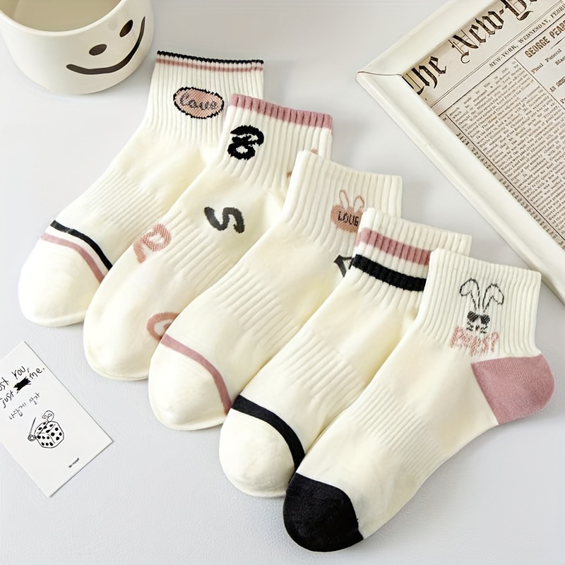 TEMU 5켤레 여성용 부드러운 발목 양말 - 귀여운 만화 패턴과 핑크 글자, 통기성 좋은 라운드 넥 캐주얼 양말, 손세탁 전용, 재미있는 디자인의 편안한 신발 소재